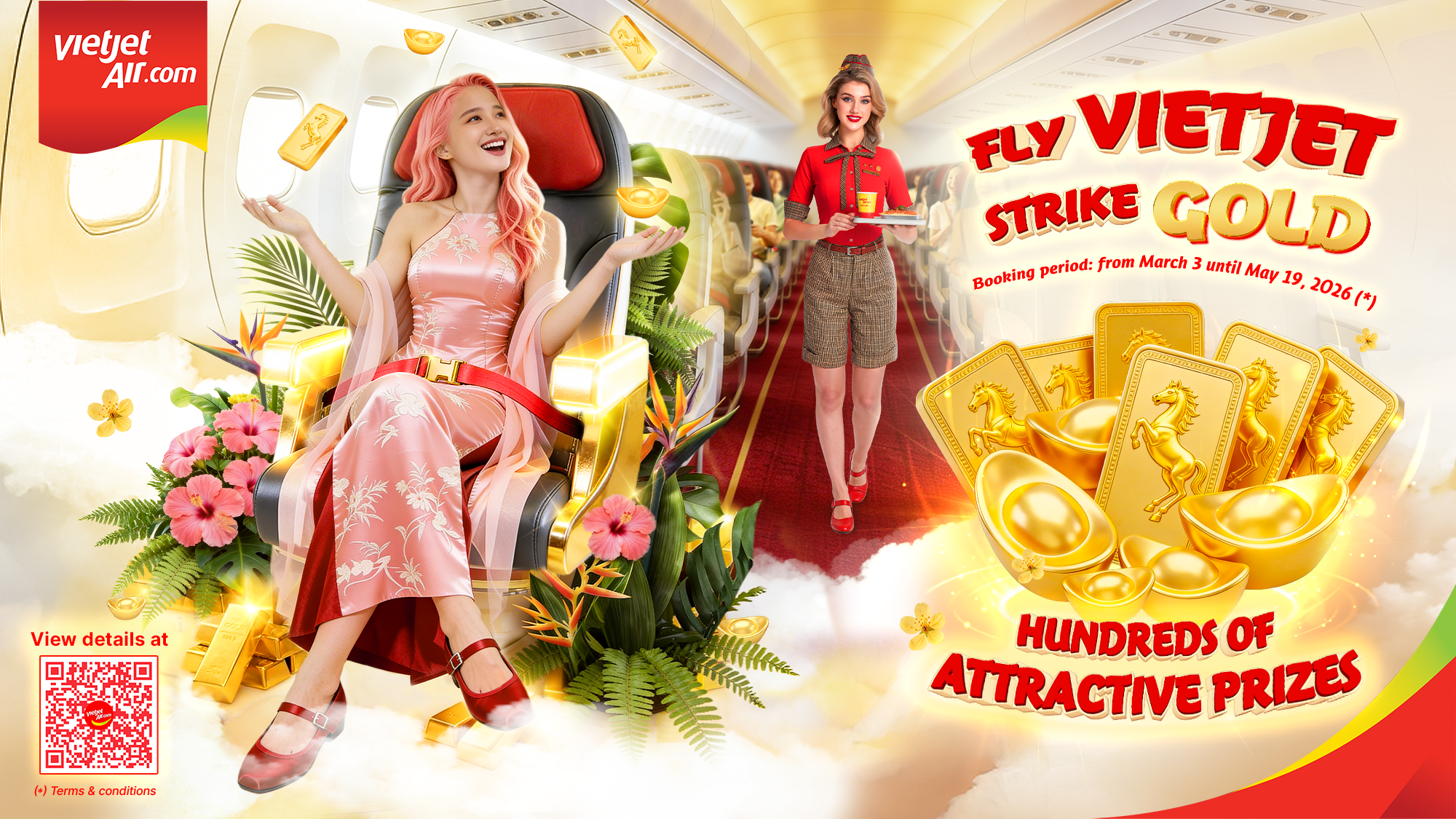 ភ្នំពេញ​៖ ថ្ងៃទី ០២ ខែមីនា ឆ្នាំ ២០២៦​ ក្រុមហ៊ុនអាកាសចរណ៍ Vietjet សូមអញ្ជើញអ្នកដំណើរពីប្រទេសកម្ពុជា ធ្វើដំណើរកម្សាន្តដើម្បីទទួលបានបទពិសោធន៍វប្បធម៌ដ៏រស់រវើករបស់ប្រទេសវៀតណាម ម្ហូបអាហារដ៏ល្បីល្បាញលើពិភពលោក និងទេសភាពដ៏ស្រស់ស្អាត ជាមួយនឹងការប្រូម៉ូសិនបញ្ចុះតម្លៃសំបុត្រពិសេសរបស់ខ្លួន គឺ “ធ្វើដំណើរជាមួយ Vietjet មានឱកាសឈ្នះរង្វាន់មាស (Fly Vietjet, Strike Gold)” ដែលចាប់ផ្តើមពីថ្ងៃទី ៣ ខែមីនា ដល់ថ្ងៃទី ១៩ ខែឧសភា ឆ្នាំ ២០២៦។ Vietjet ក៏កំពុងផ្តល់ជូនប្រូម៉ូសិនដ៏គួរឱ្យទាក់ទាញសម្រាប់ទិវានារីអន្តរជាតិ ដោយផ្តល់ជូននូវការបញ្ចុះតម្លៃពិសេសលើជើងហោះហើរសៀមរាប-ហាណូយ និងទូទាំងបណ្តាញរបស់ខ្លួន។