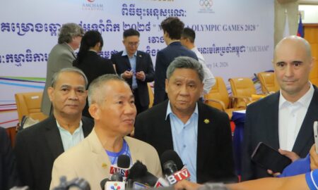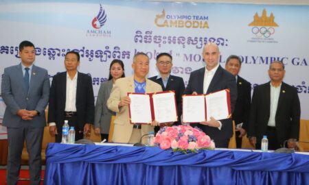 ភ្នំពេញ ៖ លោក វ៉ាត់ ចំរើន អគ្គលេខាធិការ គណៈកម្មាធិការជាតិអូឡាំពិកកម្ពជា បានមានប្រសាសន៍ថា ថ្ងៃនេះជាថ្ងៃប្រវត្តិសាស្ត្រ សម្រាប់ចលនាកីឡា អូឡាំពិកកម្ពុជា យើងកំពុងធ្វើការមួយដើម្បីប្រជាជនខ្មែរ និងអត្តពលិកកម្ពុជាមានសង្ឃឹម ព្រមទាំងយកចិត្តទុកដាក់នឹងចលនាកីឡាអូឡាំពិក និងដៃគូពាក់ព័ន្ធទំាងអស់ ដូច្នេះហើយថ្ងៃនេះទទួលបានការគាំទ្រ យ៉ាងពេញទំហឹងពីលោក ខេស៊ី បាណេត ប្រធានក្រុមប្រឹក្សាភិបាល នៃសមាគមសភាពាណិជ្ជកម្ម អាមេរិក...