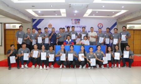 ភ្នំពេញ៖ លោក ស៊ឹម ទូច ជាអនុប្រធានសហព័ន្ធកឡាចំបាប់កម្ពុជាតំណាងលោក វ៉ាត់ ចំរើន ប្រធានសហព័ន្ធកឡាចំបាប់កម្ពុជា និងរដ្ឋលេខាធិការនៃក្រសួងអប់រំ យុវជន និងកីឡា និងលោកស្រី កាង ណុចបវរ អគ្គលេខាធិការសហព័ន្ធកីឡាចំបាប់កម្ពុជា នាថ្ងៃទី២៧ ខែវិច្ឆិកា ឆ្នាំ២០២៥ បានអញ្ជើញចូលរួមពិធីបិទ វគ្គបណ្តុះបណ្តាលអាជ្ញាកណ្តាល និងចៅក្រមកីឡាចំបាប់កម្រិតមូលដ្ឋានដែលមានរយៈពេល ៥...