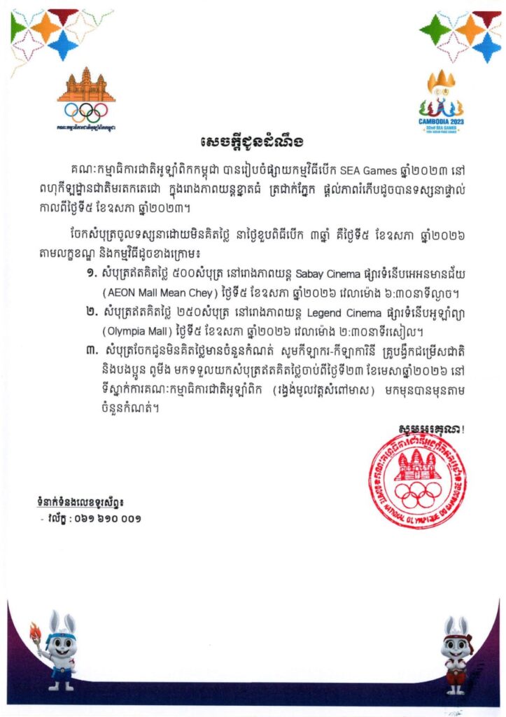 ៣. សំបុត្រចែកជូនមិនគិតថ្លៃមានចំនួនកំណត់ សូមកីឡាករ-កីឡាការិនី គ្រូបង្វឹកជម្រើសជាតិ និងបងប្អូន ពូមីង មកទទួលយកសំបុត្រឥតគិតថ្លៃចាប់ពីថ្ងៃទី២៣ ខែមេសាឆ្នាំ២០២៦ នៅ ទីស្នាក់ការគណៈកម្មាធិការជាតិអូឡាំពិក (រង្វង់មូលវត្តសំពៅមាស) មកមុនបានមុនតាម ចំនួនកំណត់។