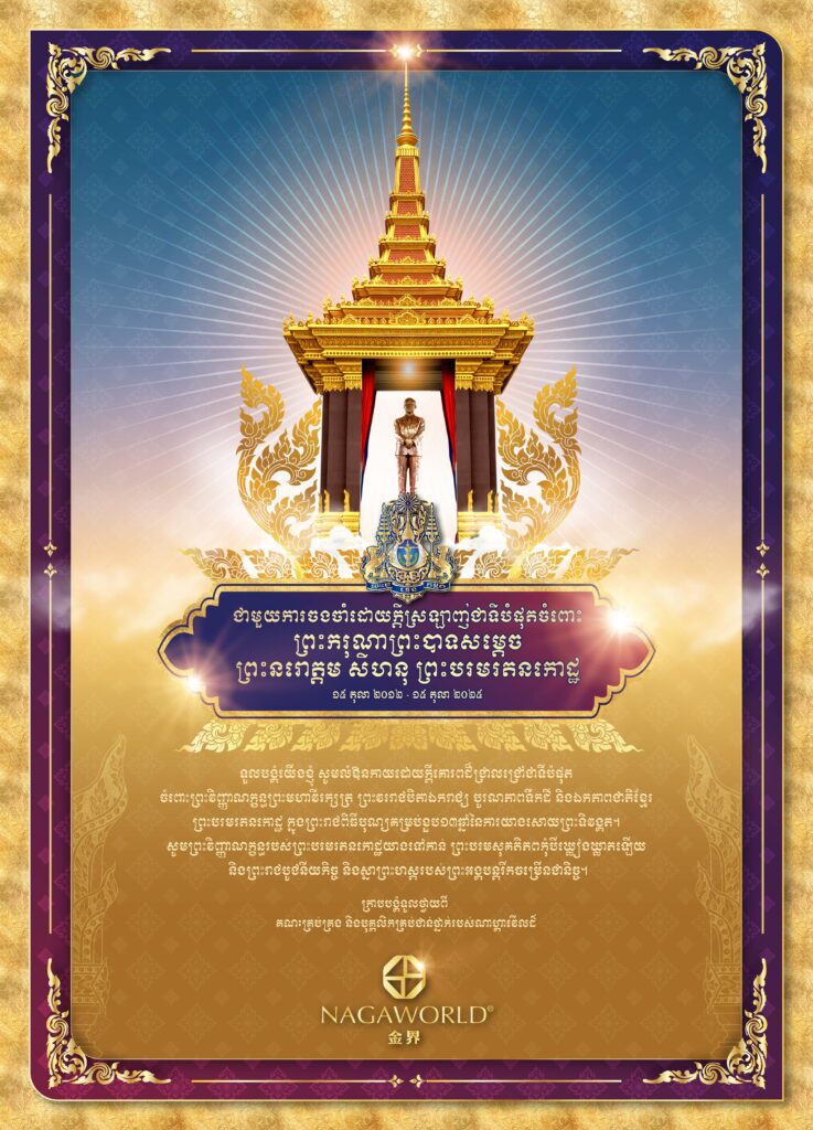 រាជធានីភ្នំពេញ ៖ ក្នុងនាមគណៈគ្រប់គ្រង និងបុគ្គលិកគ្រប់ជាន់ថ្នាក់របស់ ណាហ្គាវើលដ៍ ទូលព្រះបង្គំយើងខ្ញុំ សូមលំឱនកាយដោយក្ដីគោរពដ៏ជ្រាលជ្រៅជាទីបំផុតចំពោះ ព្រះវិញ្ញាណក្ខន្ធ នៃព្រះករុណាព្រះបាទសម្តេចព្រះនរោត្តម សីហនុ ព្រះមហាវីរក្សត្រ ព្រះវររាជបិតាឯករាជ្យ បូរណភាពទឹកដី និងឯកភាពជាតិខ្មែរ «ព្រះបរមរតនកោដ្ឋ» ក្នុងព្រះរាជពិធីរំលឹកខួប១៣ឆ្នាំ នៃការយាងចូលទិវង្គត។