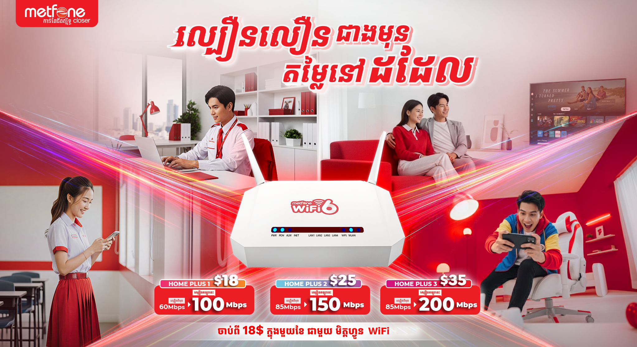 Metfone បានប្រកាសជាផ្លូវការអំពី ការធ្វើឱ្យប្រសើរឡើងដ៏ធំបំផុតរបស់ខ្លួន សម្រាប់សេវាកម្មអ៊ីនធឺណិត Wi-Fi ដោយផ្តល់នូវការកើនឡើងយ៉ាងខ្លាំងនៃ ល្បឿនចូលប្រើសម្រាប់អតិថិជន ខណៈពេលដែលតម្លៃសេវាប្រចាំខែរក្សានៅដដែល។ ការផ្លាស់ប្តូរជាយុទ្ធសាស្ត្រនេះបញ្ជាក់ជាថ្មីនូវការប្តេជ្ញាចិត្តរបស់ Metfone ចំពោះការផ្លាស់ប្តូរឌីជីថល ដោយធានាថាការតភ្ជាប់ល្បឿនលឿន នៅតែអាចចូលដំណើរការបាន និងងាយស្រួលសម្រាប់មនុស្សគ្រប់គ្នា។
