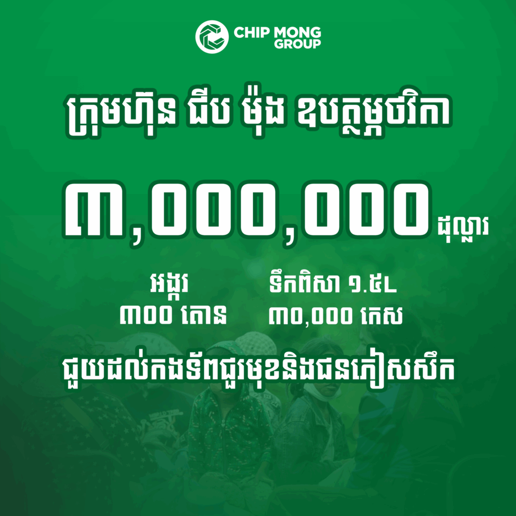(ភ្នំពេញ)៖​ ក្រោយស្ថានភាពតានតឹងភ្លាមៗនៅតាមបន្ទាត់ព្រំដែន ជីប ម៉ុង ប្រកាសឧបត្ថម្ភថវិកាចំនួន ៣ លានដុល្លារ អង្ករ ៣០០ តោន និងទឹកពិសាកម្ពុជាចំណុះ ១.៥ លីត្រ ចំនួន ៣ ម៉ឺនកេស​ ជូនដល់ប្រជាជនភៀសសឹក និងវីរកងទ័ពជួរមុខកម្ពុជា។