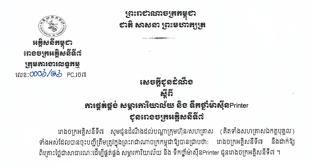 សេចក្ដីជូនដំណឹង ស្ដីពីការផ្គត់ផ្គង់ សម្ភារការិយាល័យ និងទឹកថ្នាំម៉ាស៊ីន Printer ជូនរោងចក្រអគ្គិសនីទី៧