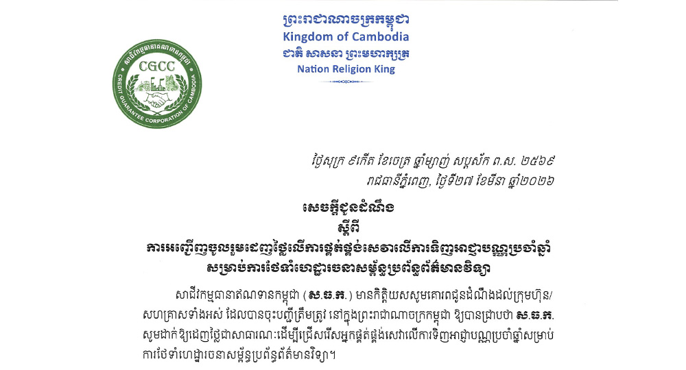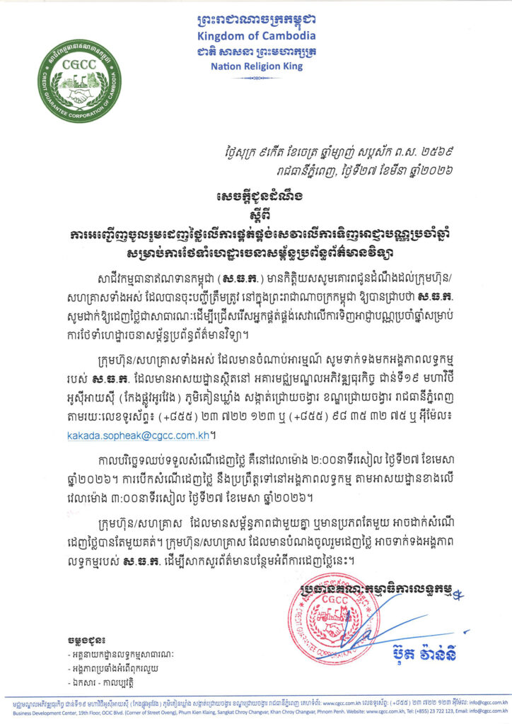 សេចក្ដីជូណដំណឹង ស្ដីពីការអញ្ជើញចូលរួមដេញថ្លៃ លើការផ្គត់ផ្គង់សេវាលើការទិញអាជ្ញាបណ្ណប្រចាំឆ្នាំ សម្រាប់ការថែទាំហេដ្ឋារចនាសម្ព័ន្ធប្រព័ន្ធព័ត៌មានវិទ្យា