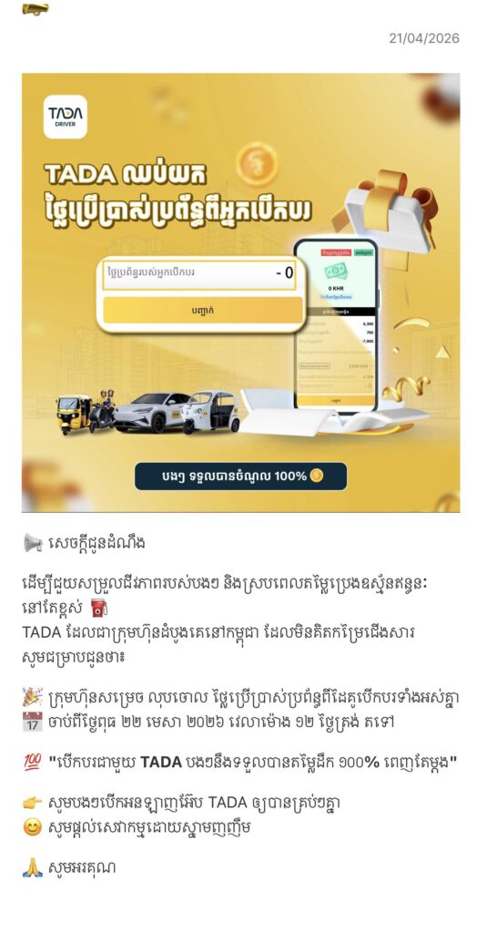 ភ្នំពេញ៖ ថ្ងៃទី២៣ ខែមេសា ឆ្នាំ២០២៦ ក្រុមហ៊ុន TADA បានបញ្ចប់ការយកថ្លៃសេវាប្រើប្រាស់ប្រព័ន្ធទាំងស្រុងពីអ្នកបើកបរ ពោលគឺដៃគូបើកបរដឹកអ្នកដំណើរពុំចាំបាច់ត្រូវបង់ថ្លៃប្រើប្រាស់ប្រព័ន្ធក្នុងអែបTADAទៀតនោះទេ។ គំនិតផ្ដួចផ្ដើមនេះ គឺស្របតាមចក្ខុវិស័យស្នូលរបស់ TADA ដើម្បីលើកកម្ពស់ជីវភាពដៃគូបើកបរ និងឆ្លើយតបទៅនឹងការកើនឡើងថ្លៃប្រេងឥន្ធនៈ និងហ្គាសនៅទូទាំងពិភពលោក ដែលធ្វើឲ្យប៉ះពាល់យ៉ាងធ្ងន់ធ្ងរទៅដល់ប្រាក់ចំណូលរបស់ដៃគូបើកបរ។