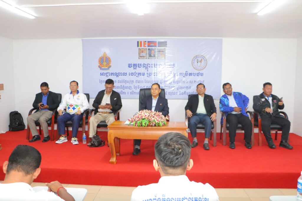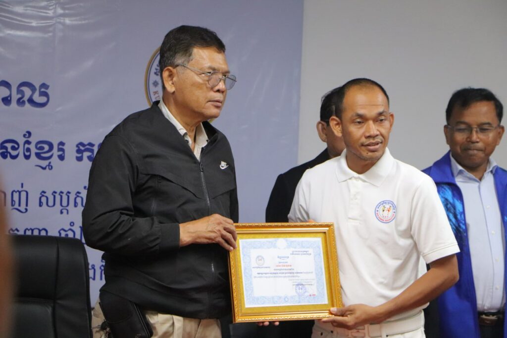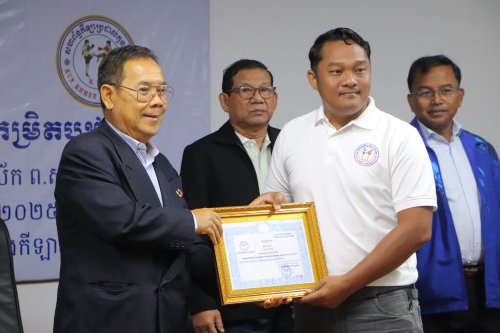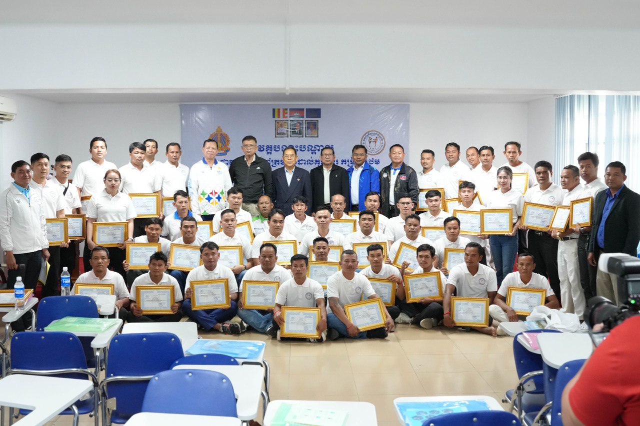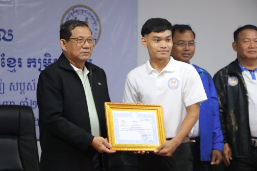 ភ្នំពេញ៖ លោក ម៉ិល កាដូ អនុប្រធានសហព័ន្ធកីឡាប្រដាល់គុនខ្មែរតំណាងឲ្យលោក ខូវ ឆាយ ប្រធានសហព័ន្ធកីឡាប្រដាល់គុនខ្មែរលោក ហួត សេងទ្រី ប្រធាននាយកដ្ឋានរៀបចំព្រឹត្តិការណ៍និងស្ថិតិកីឡា និងលោក ទុយ ប៊ុនហឿន អនុប្រធាននាយកដ្ឋាន តំណាង លោក ប៉ែន វុទ្ធី ប្រធាននាយកដ្ឋានកីឡាជំនាញ និងកីឡាមហាជន នាថ្ងៃទី១២ ខែកញ្ញា ឆ្នាំ២០២៥បានអញ្ជើញចូលរួមពិធីបិទវគ្គបណ្តុះបណ្តាលអាជ្ញាកណ្តាល ចៅក្រម កីឡាប្រដាល់គុនខ្មែរ កម្រិតបឋម នៅសាលប្រជុំនាយកដ្ឋានរៀបចំព្រឹត្តិការណ៍និងស្ថិតិកីឡា ពហុកីឡដ្ឋានជាតិអូឡាំពិក។