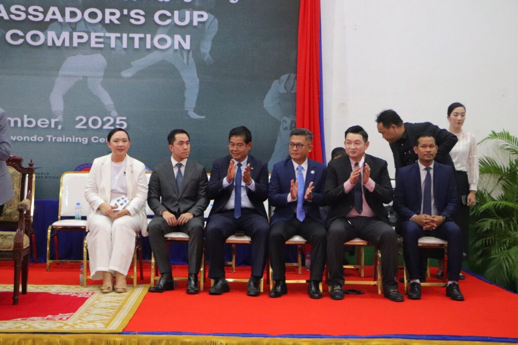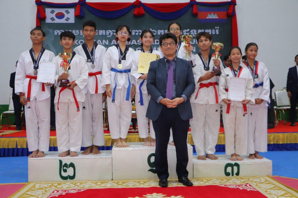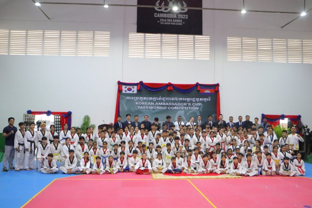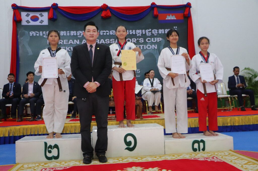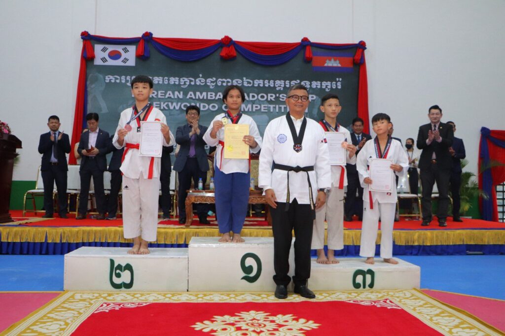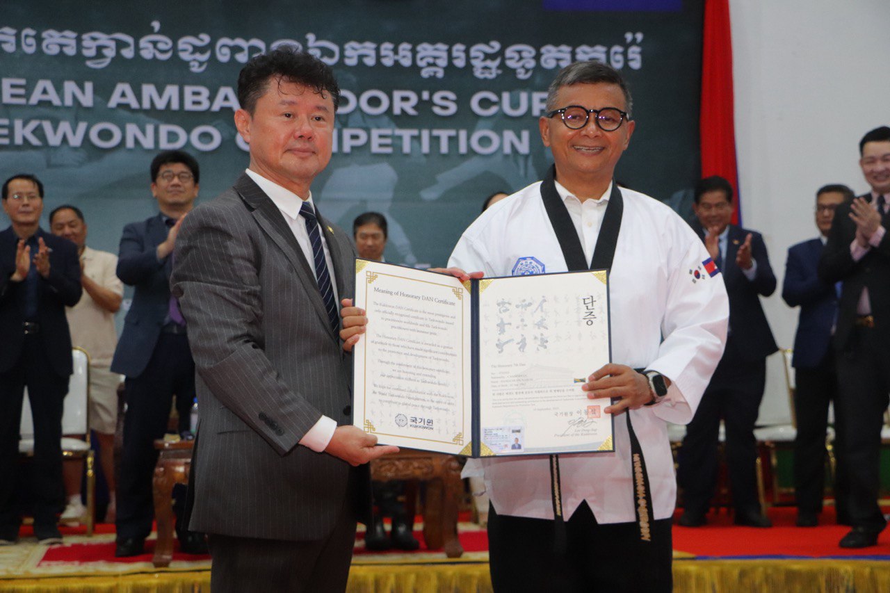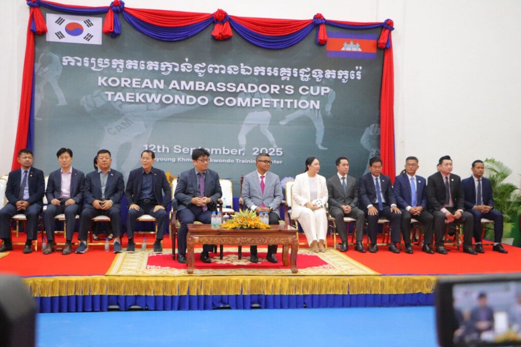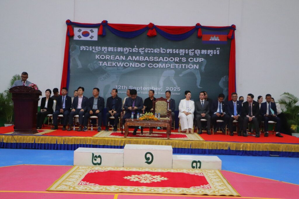 ភ្នំពេញ៖ នាថ្ងៃទី១២ ខែកញ្ញា ឆ្នាំ២០២៥ លោកបណ្ឌិតសភាចារ្យ ហង់ជួន ណារ៉ុន ឧបនាយករដ្ឋមន្ត្រី រដ្ឋមន្ត្រីក្រសួងអប់រំ យុវជន និងកីឡា និងជាប្រធានខេមរសហព័ន្ធកីឡាតេក្វាន់ដូ និងលោក KIM HYUN-SOO ភារធារី នៃស្ថានទូតសាធារណរដ្ឋកូរ៉េប្រចាំកម្ពុជាបានអញ្ជើញជាអធិបតីក្នុងពិធីបិទការប្រកួតតេក្វាន់ដូពានរង្វាន់ឯកអគ្គរដ្ឋទូតសាធារណរដ្ឋកូរ៉េ ប្រចាំឆ្នាំ២០២៥ “KOREAN AMBASSADOR’S CUP TAEKWONDO COMPETITION 2025 “ នៅសាលហ្វឹកហាត់តេក្វាន់ដូប៊ូយ៉ុង-ខ្មែរ ក្នុងពហុកីឡដ្ឋានជាតិអូឡាំពិក។