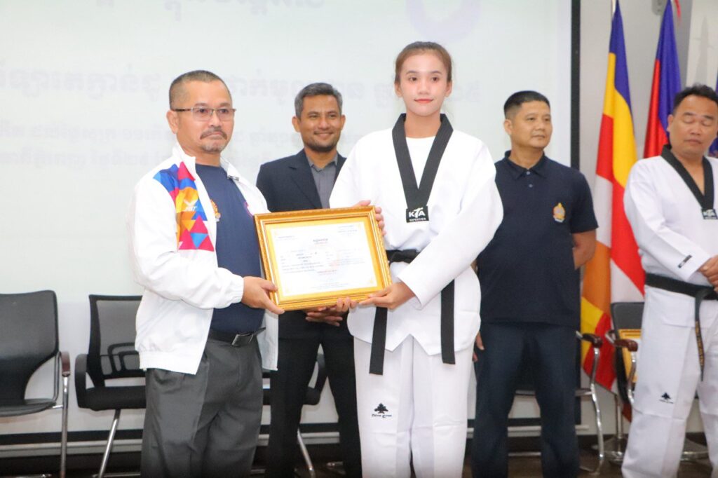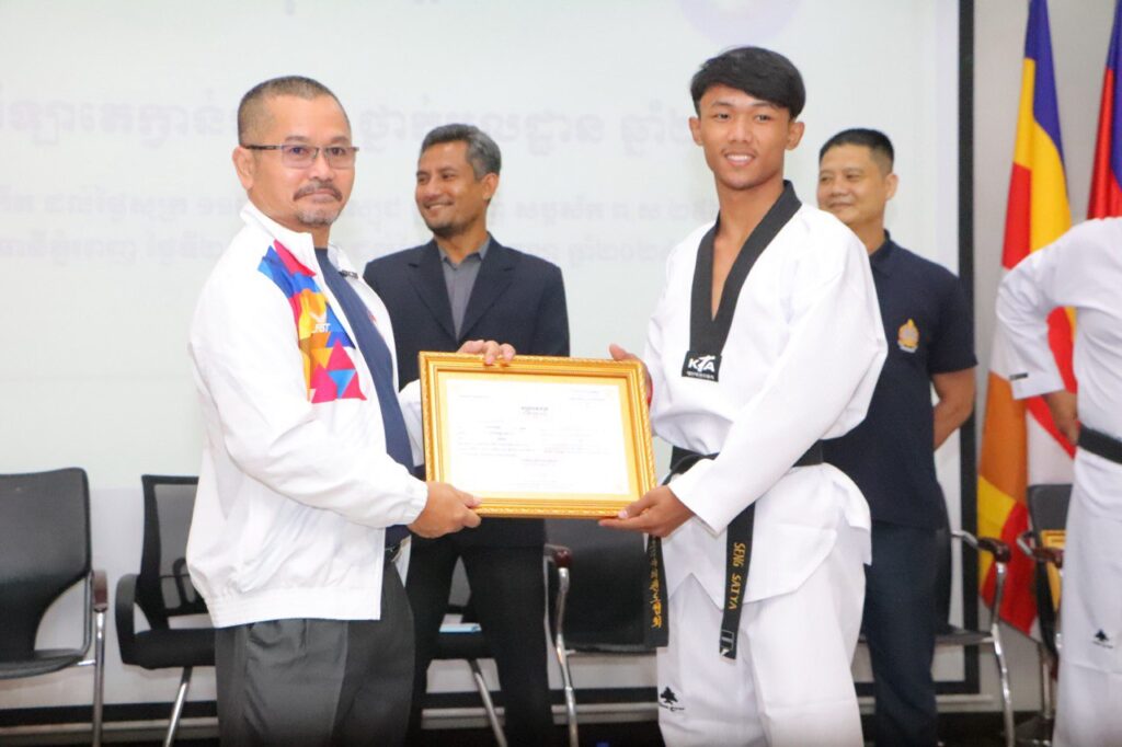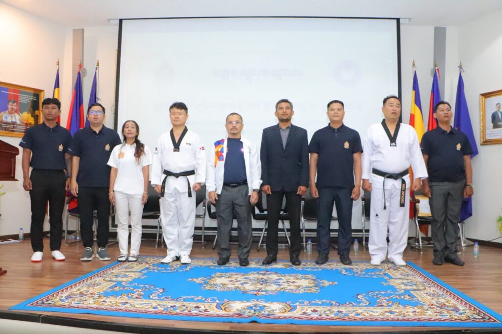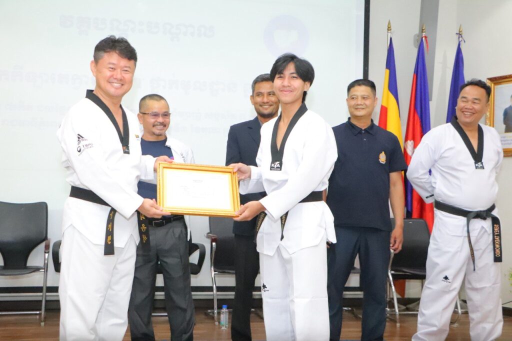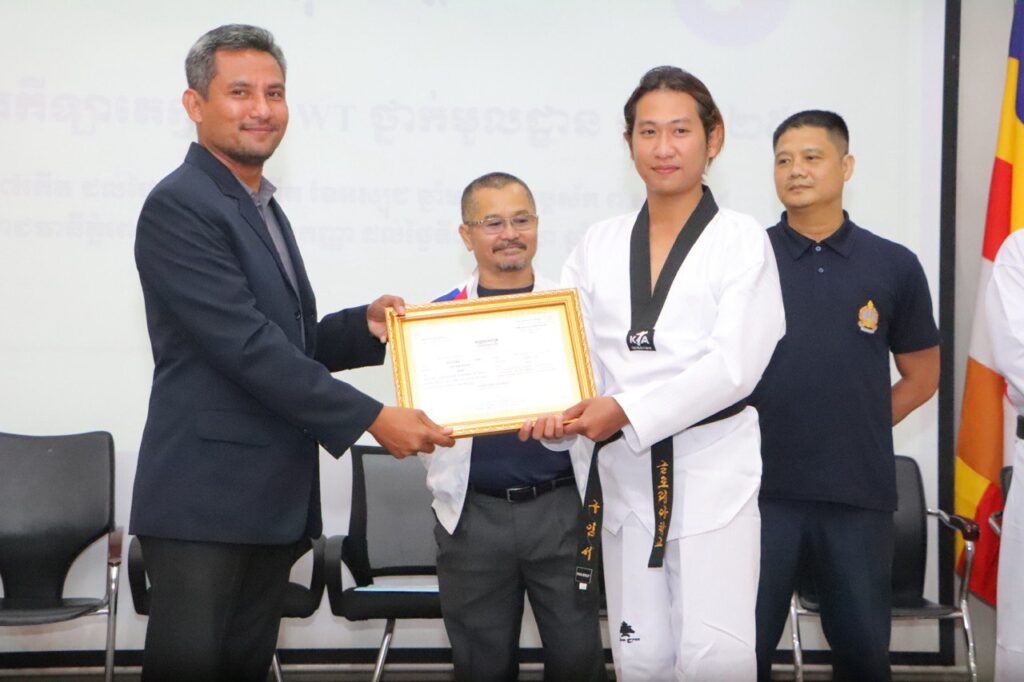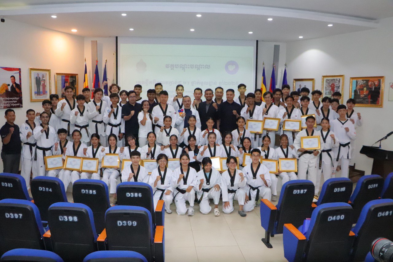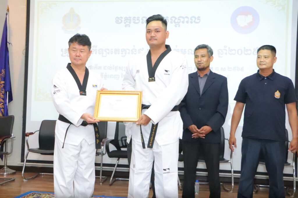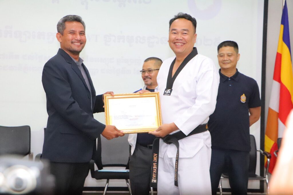 ភ្នំពេញ៖ លោក គង់ សក្ខិដា អគ្គលេខាធិការរងខេមរសហព័ន្ធតេក្វាន់ដូ តំណាងលោកបណ្ឌិតសភាចារ្យ ហង់ជួន ណារ៉ុន ឧបនាយករដ្ឋមន្ត្រី រដ្ឋមន្ត្រីក្រសួងអប់រំ យុវជន និងកីឡា និងជាប្រធានខេមរសហព័ន្ធតេក្វាន់ដូ និងលោក ទុយ វិច្ឆិកាប្រធានការិយាល័យកីឡាជំនាញនិងកីឡាមហាជន តំណាងលោកប្រធាននាយកដ្ឋានកីឡាជំនាញនិងកីឡាមហាជននៃក្រសួងអប់រំ យុវជន និងកីឡា និងលោក CHOI YONGSOK តំណាងស្ថាប័ន KUKKIWON និងជាគ្រូឧទ្ទេសបានអញ្ជើញចូលរួមពិធីបិទវគ្គបណ្តុះបណ្តាលគ្រូបង្វឹកតេក្វាន់ដូ WT ថ្នាក់មូលដ្ឋាន ប្រចាំឆ្នាំ២០២៥ នាថ្ងៃទី៣ ខែតុលា ឆ្នាំ២០២៥ នៅសាលប្រជុំមជ្ឈមណ្ឌលជាតិហ្វឹកហ្វឺនកីឡា រាជធានីភ្នំពេញ។