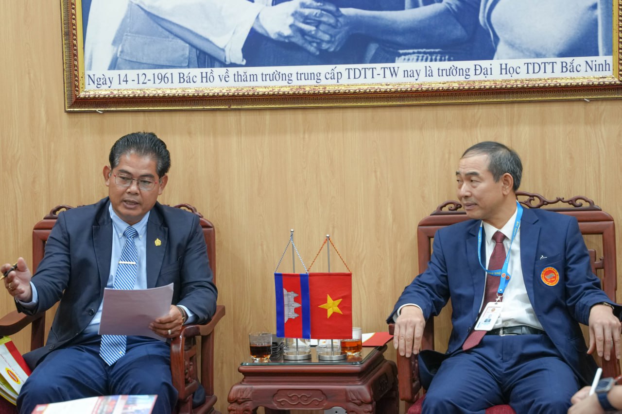 វៀតណាម៖ នារសៀលថ្ងៃទី១៣ ខែតុលា ឆ្នាំ២០២៥ លោក ប៉ុន សុខ អគ្គនាយក នៃអគ្គនាយកដ្ឋានកីឡា បានដឹកនាំប្រតិភូកម្ពុជាចូលរួមប្រជុំពិភាក្សា និងផ្លាស់ប្តូរកិច្ចសហប្រតិបត្តិការទៅវិញទៅមកជាមួយសាកលវិទ្យាល័យកីឡាបាក់និញ នៅទីក្រុងហាណូយ សាធារណរដ្ឋសង្គមនិយមវៀតណាម។ ដោយភាគីទាំង២ បានពិភាក្សាទៅលើ ទី១ ការបញ្ជូនអ្នកជំនាញ និងសាស្ត្រាចារ្យមកជួយបណ្តុះបណ្តាលលើជំនាញឯកទេសគ្រូបង្វឹក។