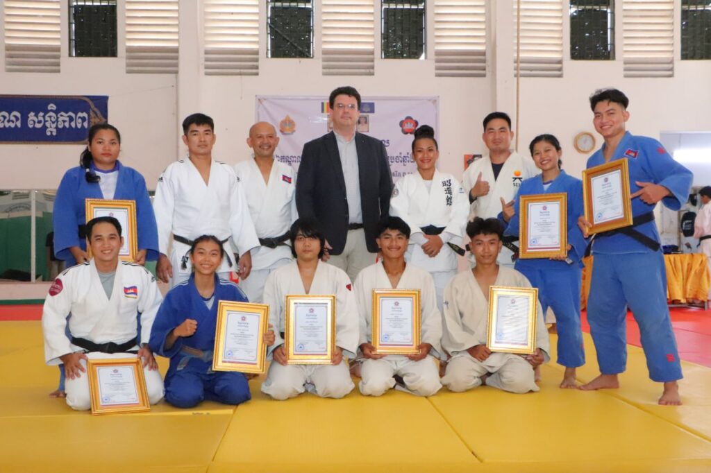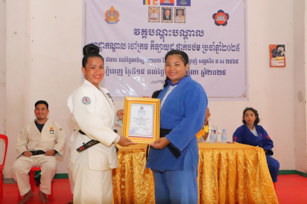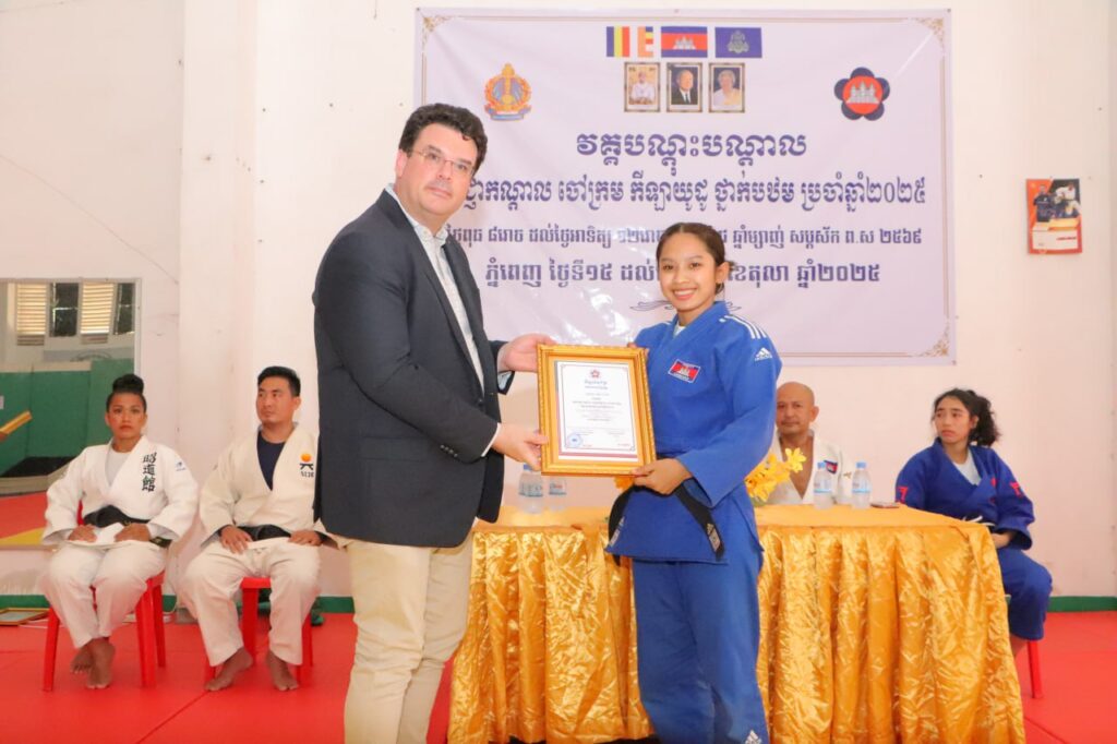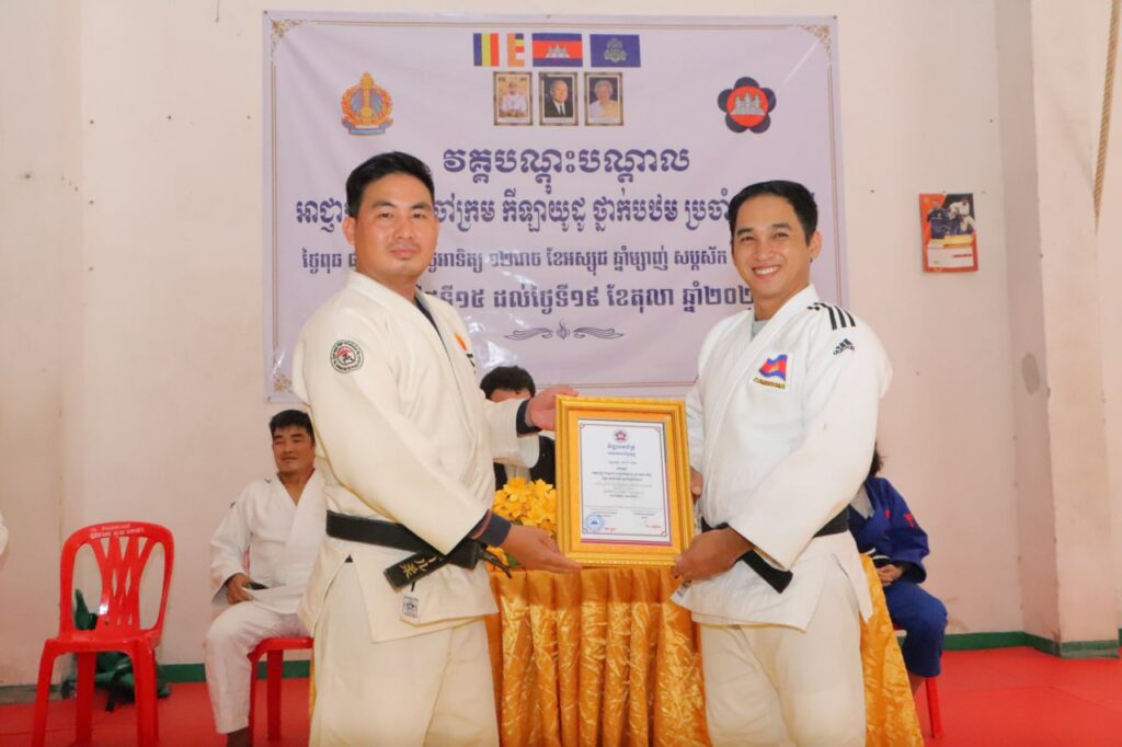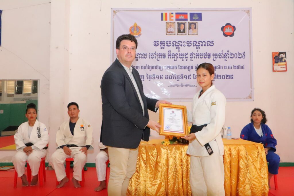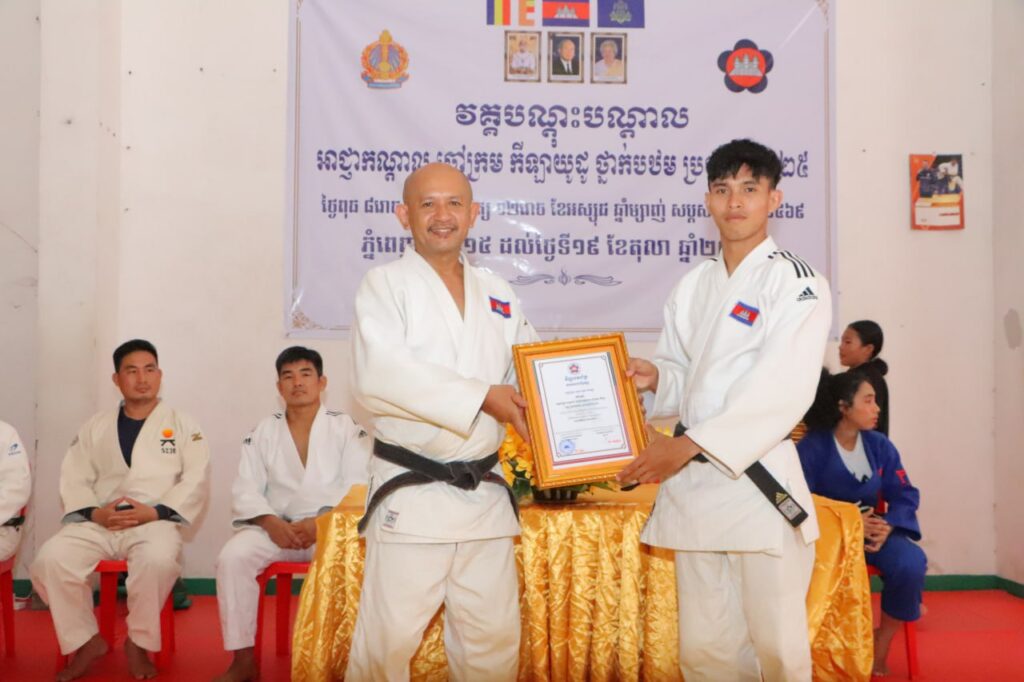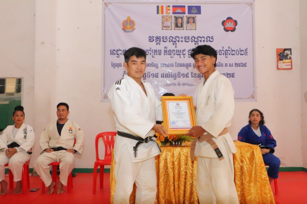 ភ្នំពេញ ៖ លោក Emmanuel Dias អនុប្រធានខេមរសហព័ន្ធយូដូ តំណាងលោក ហេង លី ប្រធានខេមរសហព័ន្ធយូដូ និងលោក ម៉ារ វង្សវិបុល ប្រធានបច្ចេកទេសខេមរសហព័ន្ធយូដូនិងគ្រូឧទ្ទេស នាថ្ងៃទី១៩ ខែតុលា ឆ្នាំ២០២៥នេះ បានអញ្ជើញចូលរួមពិធីបិទវគ្គបណ្តុះបណ្តាលអាជ្ញាកណ្តាល និងចៅក្រម កីឡាយូដូថ្នាក់បឋម ឆ្នាំ២០២៥ ដែលមានរយៈពេល ៥ថ្ងៃចាប់ពីថ្ងៃទី១៥ រហូតដល់ថ្ងៃទី១៩ ខែតុលា ឆ្នាំ២០២៥ រៀបចំដោយ ខេមរសហព័ន្ធយូដូ ក្រោមការប្រើប្រាស់ថវិកា ឧបត្ថម្ភប្រចាំឆ្នាំ របស់ក្រសួងអប់រំ យុវជន និងកីឡាប្រព្រឹត្ត នៅអាគារដំបូលទូក នៃសាលហ្វឹកហាត់របស់ខេមរសហព័ន្ធយូដូ ។