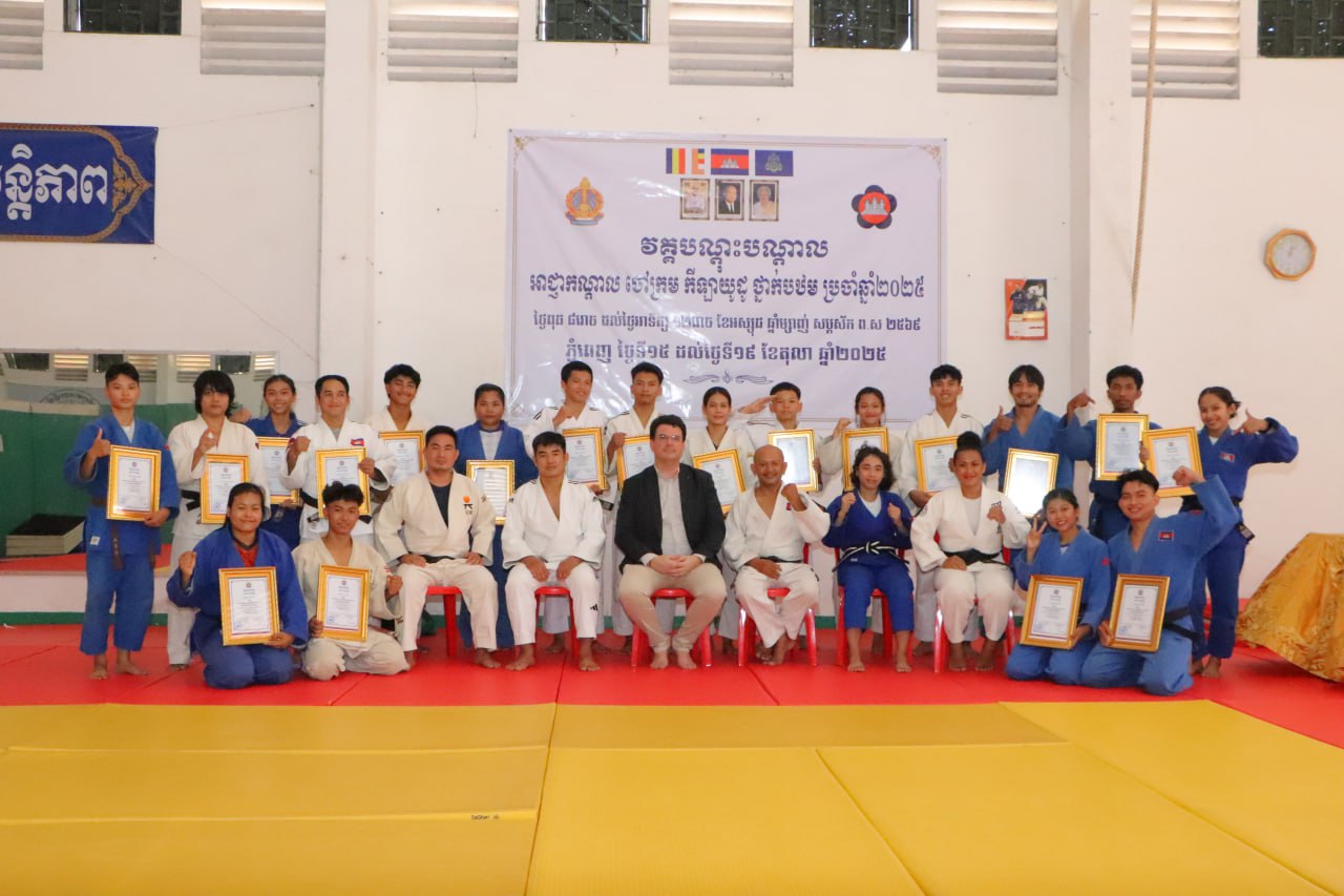 ភ្នំពេញ ៖ លោក Emmanuel Dias អនុប្រធានខេមរសហព័ន្ធយូដូ តំណាងលោក ហេង លី ប្រធានខេមរសហព័ន្ធយូដូ និងលោក ម៉ារ វង្សវិបុល ប្រធានបច្ចេកទេសខេមរសហព័ន្ធយូដូនិងគ្រូឧទ្ទេស នាថ្ងៃទី១៩ ខែតុលា ឆ្នាំ២០២៥នេះ បានអញ្ជើញចូលរួមពិធីបិទវគ្គបណ្តុះបណ្តាលអាជ្ញាកណ្តាល និងចៅក្រម កីឡាយូដូថ្នាក់បឋម ឆ្នាំ២០២៥ ដែលមានរយៈពេល ៥ថ្ងៃចាប់ពីថ្ងៃទី១៥ រហូតដល់ថ្ងៃទី១៩ ខែតុលា ឆ្នាំ២០២៥ រៀបចំដោយ ខេមរសហព័ន្ធយូដូ ក្រោមការប្រើប្រាស់ថវិកា ឧបត្ថម្ភប្រចាំឆ្នាំ របស់ក្រសួងអប់រំ យុវជន និងកីឡាប្រព្រឹត្ត នៅអាគារដំបូលទូក នៃសាលហ្វឹកហាត់របស់ខេមរសហព័ន្ធយូដូ ។