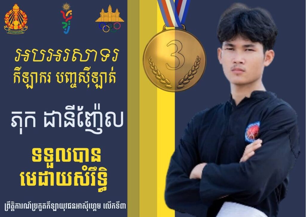 បារ៉ែន៖ កីឡាករ ភុក ដានីញែល ទទួលបានមេដាយសំរឹទ្ធក្រោយចាញ់កីឡាករជម្រើសជាតិឥណ្ឌូនេស៊ី Habbil Furgon Winata ក្នុងវគ្គពាក់កណ្ដាលផ្ដាច់ព្រ័ត្រកីឡាបញ្ចសីឡាត់ វិញ្ញាសាប្រយុទ្ធ Class D over ប្រភេទទម្ងន់៥១ដល់ ៥៥ គីឡូក្រាមក្នុងព្រឹត្តិការណ៍កីឡាយុវជនអាស៊ីលើកទី៣ ឆ្នាំ២០២៥ នៅប្រទេសបារ៉ែន៕