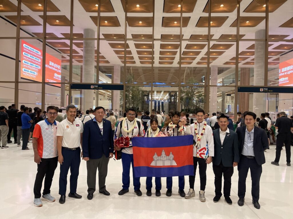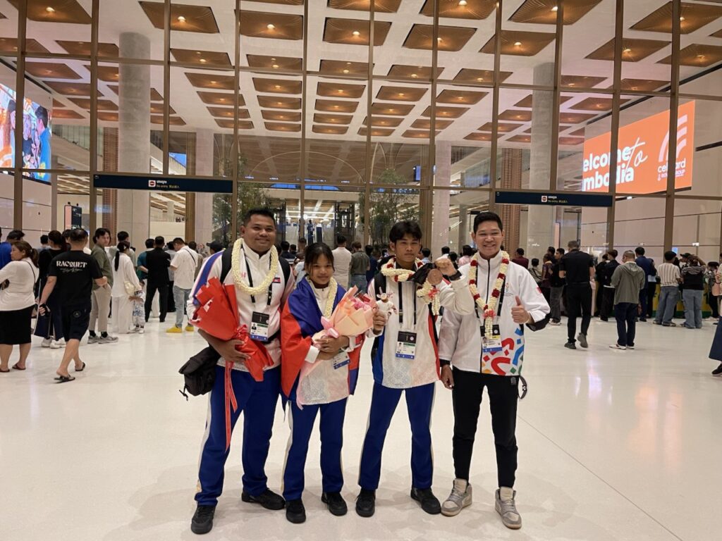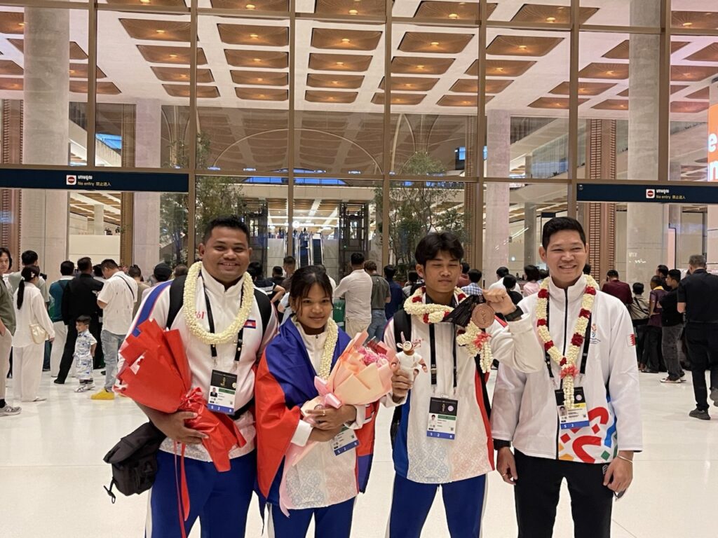 ភ្នំពេញ៖ នាយប់ថ្ងៃទី២២ ខែតុលា ឆ្នាំ២០២៥ លោក ដួង មាសចំរើន អគ្គនាយករងតំណាងលោក ប៉ុន សុខ អគ្គនាយកនៃអគ្គនាយកដ្ឋានកីឡា លោក ឈាង សុវណ្ណរតនា អនុប្រធានតំណាងលោក សេង ធារិន ប្រធានសហព័ន្ធកីឡាបញ្ចស៊ីឡាត់កម្ពុជា និងលោក ផាត បញ្ញាសុជាតក៌តំណាងលោក យាន គីស៊ីវត្ថា ប្រធានមជ្ឈមណ្ឌលជាតិហ្វឹកហ្វឺនកីឡា និងជានាយរងបេសកម្ម និងបានអញ្ជើញទទួលស្វាគមន៍ គ្រូបង្វឹក កីឡាករ-កីឡាការិនីបញ្ចស៊ីឡាត់ នៅអាកាសយានដ្ឋានអន្តរជាតិតេជោ បន្ទាប់ពីដណ្តើមបានមេដាយសំរិទ្ធក្នុងប្រកួតកីឡាយុវជនអាស៊ី លើកទី៣ នៅប្រទេសបារ៉ែន នៅអាកាសយានដ្ឋានអន្តរជាតិតេជោ។