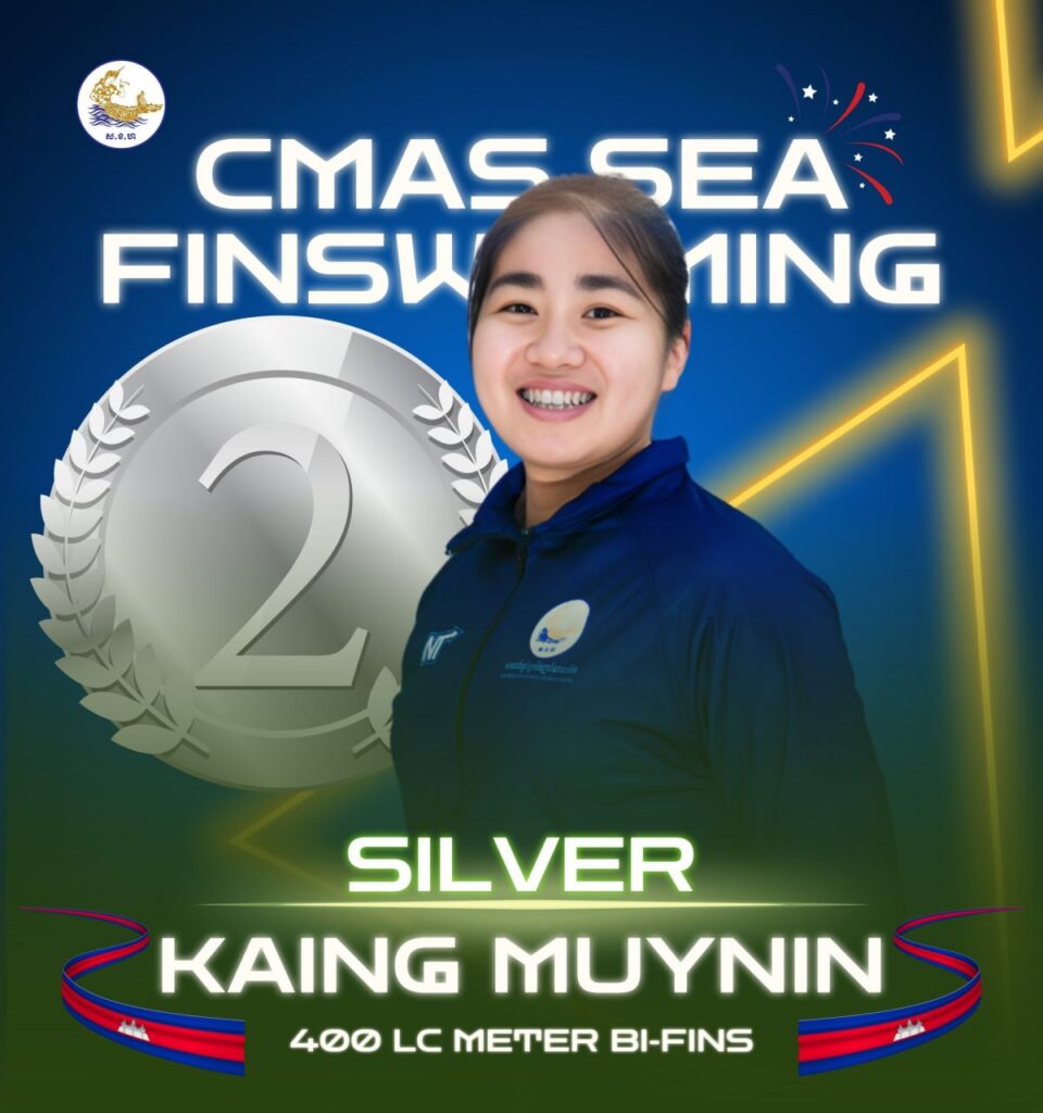 ភ្នំពេញ៖ នាថ្ងៃទី១៦ ខែវិច្ឆិកា ឆ្នាំ២០២៥ កីឡាករ-កីឡាការិនីហែលទឹកពាក់ជើងទាកម្ពុជាដណ្តើមបានមេដាយ ២ គ្រឿង គឺមេដាយប្រាក់ ១ គ្រឿង និងមេដាយសំរិទ្ធ ១ គ្រឿងក្នុងព្រឹត្តិការណ៍ប្រកួតកីឡាហែលទឹកពាក់ជើងទា ជ្រើសរើសជើងឯកអាស៊ីអាគ្នេយ៍ លើកទី២ ឆ្នាំ២០២៥ (The 2025 CMAS 2nd South East Asia Championship Finswimming Indoor) ដែលនឹងប្រព្រឹត្តទៅចាប់ពីថ្ងៃទី១៥ ដល់ថ្ងៃទី១៩ ខែវិច្ឆិកា ឆ្នាំ២០២៥ នៅហ្សារកាតា ប្រទេសឥណ្ឌូណេស៊ី។
