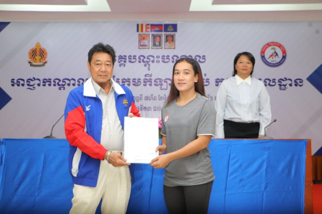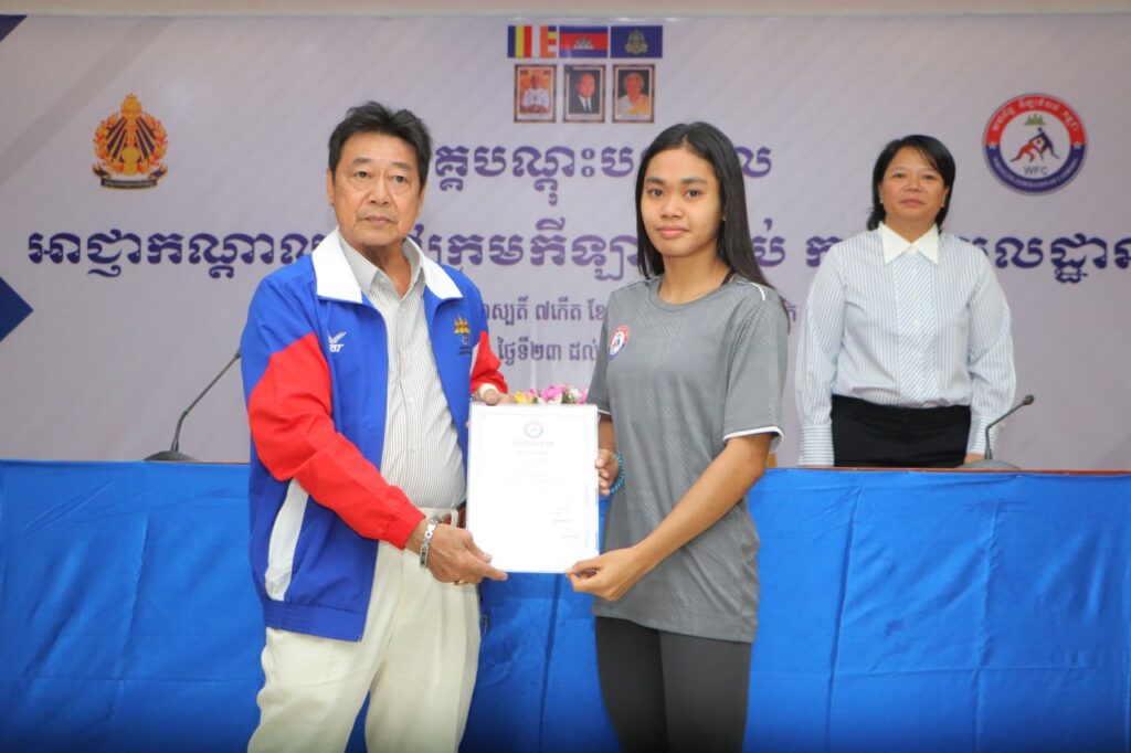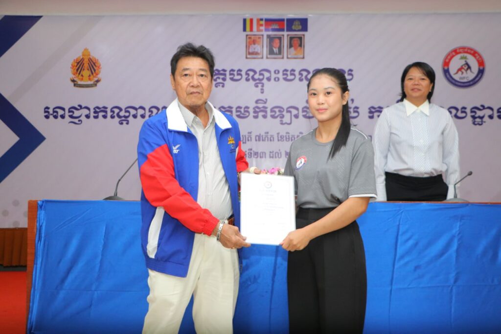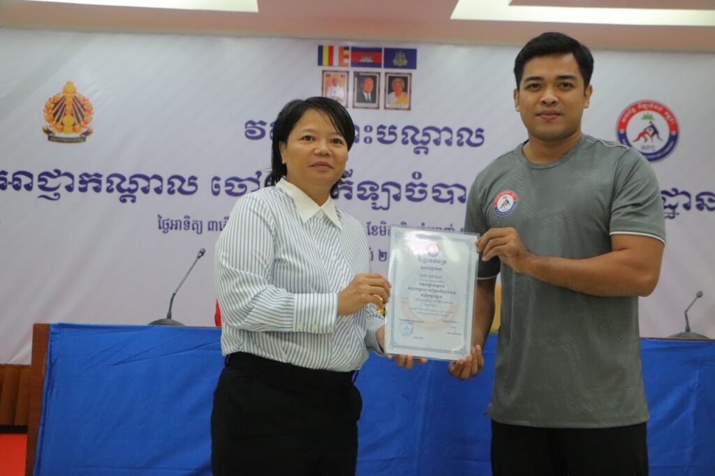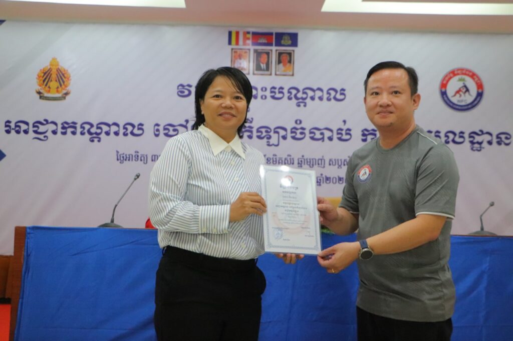 ភ្នំពេញ៖ លោក ស៊ឹម ទូច ជាអនុប្រធានសហព័ន្ធកឡាចំបាប់កម្ពុជាតំណាងលោក វ៉ាត់ ចំរើន ប្រធានសហព័ន្ធកឡាចំបាប់កម្ពុជា និងរដ្ឋលេខាធិការនៃក្រសួងអប់រំ យុវជន និងកីឡា និងលោកស្រី កាង ណុចបវរ អគ្គលេខាធិការសហព័ន្ធកីឡាចំបាប់កម្ពុជា នាថ្ងៃទី២៧ ខែវិច្ឆិកា ឆ្នាំ២០២៥ បានអញ្ជើញចូលរួមពិធីបិទ វគ្គបណ្តុះបណ្តាលអាជ្ញាកណ្តាល និងចៅក្រមកីឡាចំបាប់កម្រិតមូលដ្ឋានដែលមានរយៈពេល ៥ ថ្ងៃចាប់ពីថ្ងៃទី២៣ រហូតដល់ថ្ងៃទី២៧ ខែវិច្ឆិកា ឆ្នាំ២០២៥នៅ ទីស្នាក់ការគណៈកម្មាធិការជាតិអូឡាំពិកកម្ពុជា ក្រោមការប្រើប្រាស់គាំទ្រ ប្រចាំឆ្នាំរបស់ក្រសួងអប់រំ យុវជន និងកីឡា។