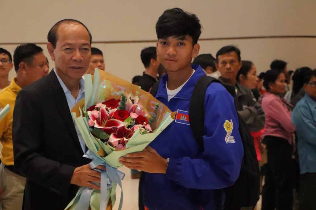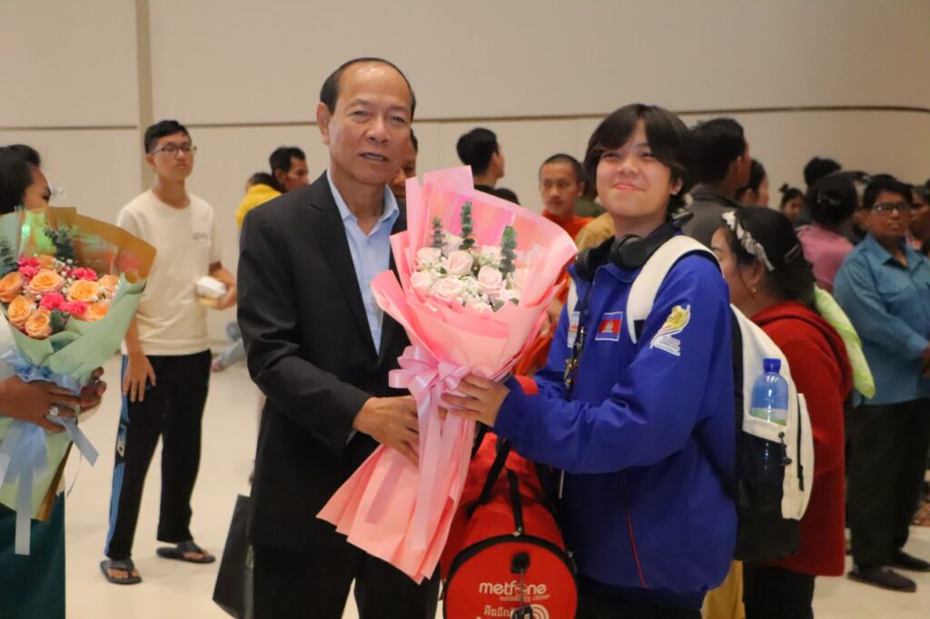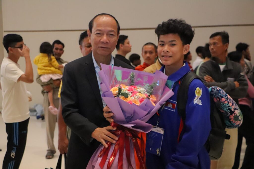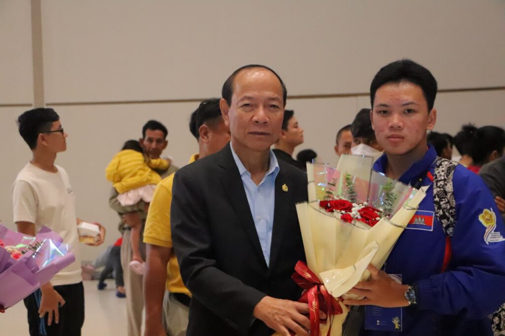 ភ្នំពេញ៖ លោក កែ ប៊ុនខៀង រដ្ឋលេខាធិការក្រសួងអប់រំ យុវជន និងកីឡា និងជាប្រធានសហព័ន្ធកីឡាសិស្ស និស្សិតកម្ពុជា និងលោក ប៉ុន សុខ អគ្គនាយកកីឡា និងជាអគ្គលេខាធិការសហព័ន្ធកីឡាសិស្ស និស្សិតកម្ពុជា នាយប់ថ្ងៃទី២៩ ខែវិច្ឆិកា ឆ្នាំ២០២៥ បានអញ្ជើញចូលរួមទទួលស្វាគមន៍យ៉ាងកក់ក្ដៅការវិលត្រឡប់គ្រូបង្វឹក និងកីឡាករ-កីឡាការិនី វូស៊ូ និងកីឡាអត្តពលកម្មចំនួន ១៣ នាក់ បន្ទាប់បញ្ចប់ការប្រកួតក្នុងព្រឹត្តិការណ៍ការប្រកួតកីឡាសិស្សអាស៊ាន លើកទី១៤ ជូនជាតិមាតុភូមិ នៅប្រទេសប៊្រុយណេ ដារូសាឡឹម នាអាកាសយានដ្ឋានអន្តរជាតិតេជោ។