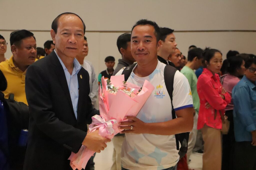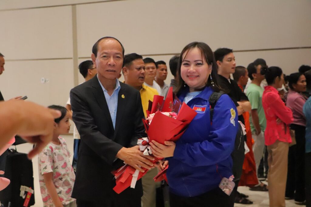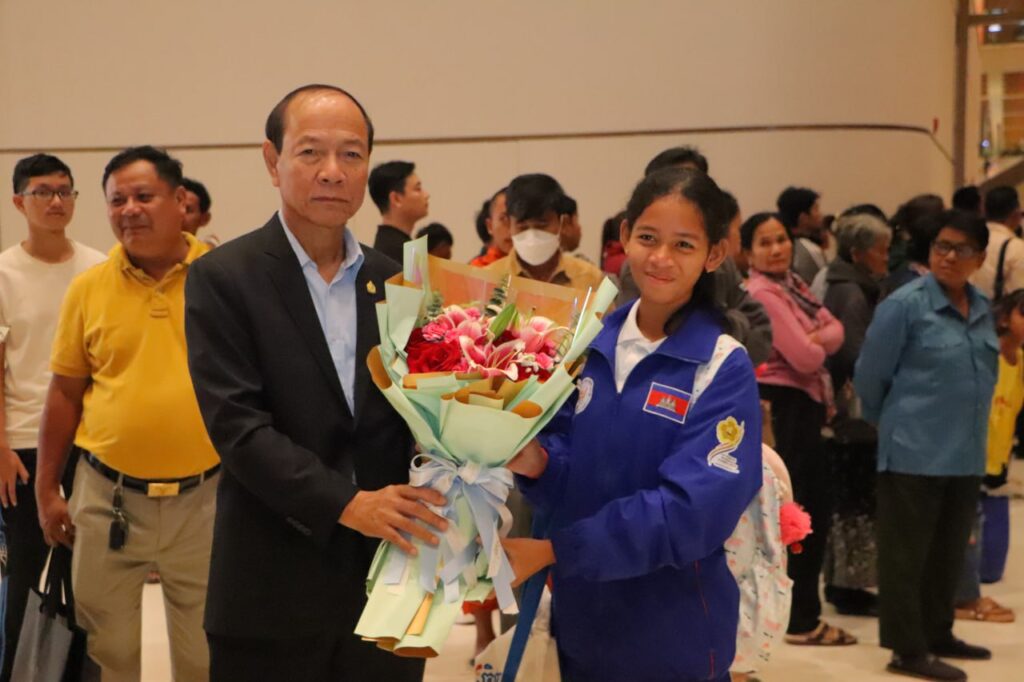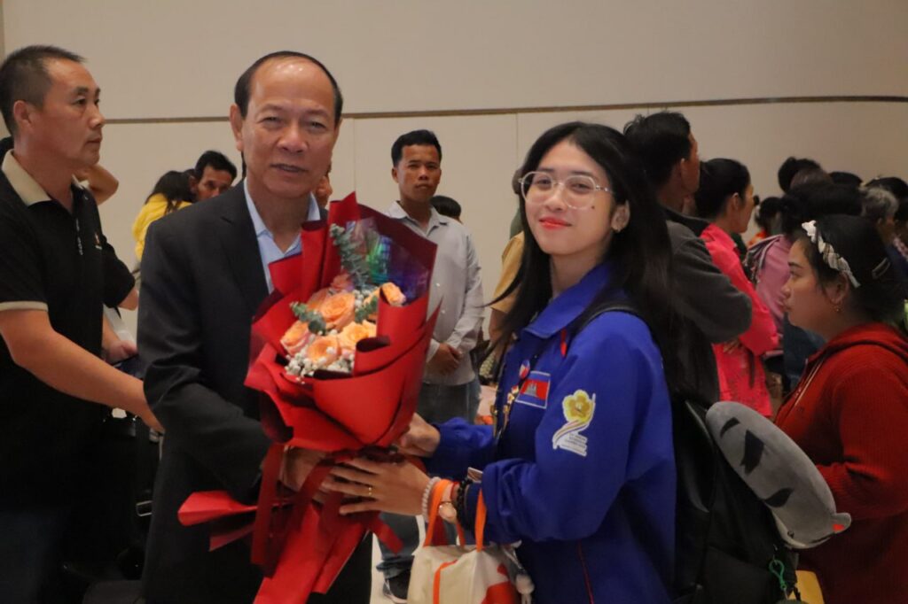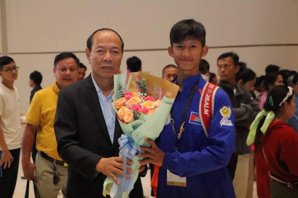 ភ្នំពេញ៖ លោក កែ ប៊ុនខៀង រដ្ឋលេខាធិការក្រសួងអប់រំ យុវជន និងកីឡា និងជាប្រធានសហព័ន្ធកីឡាសិស្ស និស្សិតកម្ពុជា និងលោក ប៉ុន សុខ អគ្គនាយកកីឡា និងជាអគ្គលេខាធិការសហព័ន្ធកីឡាសិស្ស និស្សិតកម្ពុជា នាយប់ថ្ងៃទី២៩ ខែវិច្ឆិកា ឆ្នាំ២០២៥ បានអញ្ជើញចូលរួមទទួលស្វាគមន៍យ៉ាងកក់ក្ដៅការវិលត្រឡប់គ្រូបង្វឹក និងកីឡាករ-កីឡាការិនី វូស៊ូ និងកីឡាអត្តពលកម្មចំនួន ១៣ នាក់ បន្ទាប់បញ្ចប់ការប្រកួតក្នុងព្រឹត្តិការណ៍ការប្រកួតកីឡាសិស្សអាស៊ាន លើកទី១៤ ជូនជាតិមាតុភូមិ នៅប្រទេសប៊្រុយណេ ដារូសាឡឹម នាអាកាសយានដ្ឋានអន្តរជាតិតេជោ។