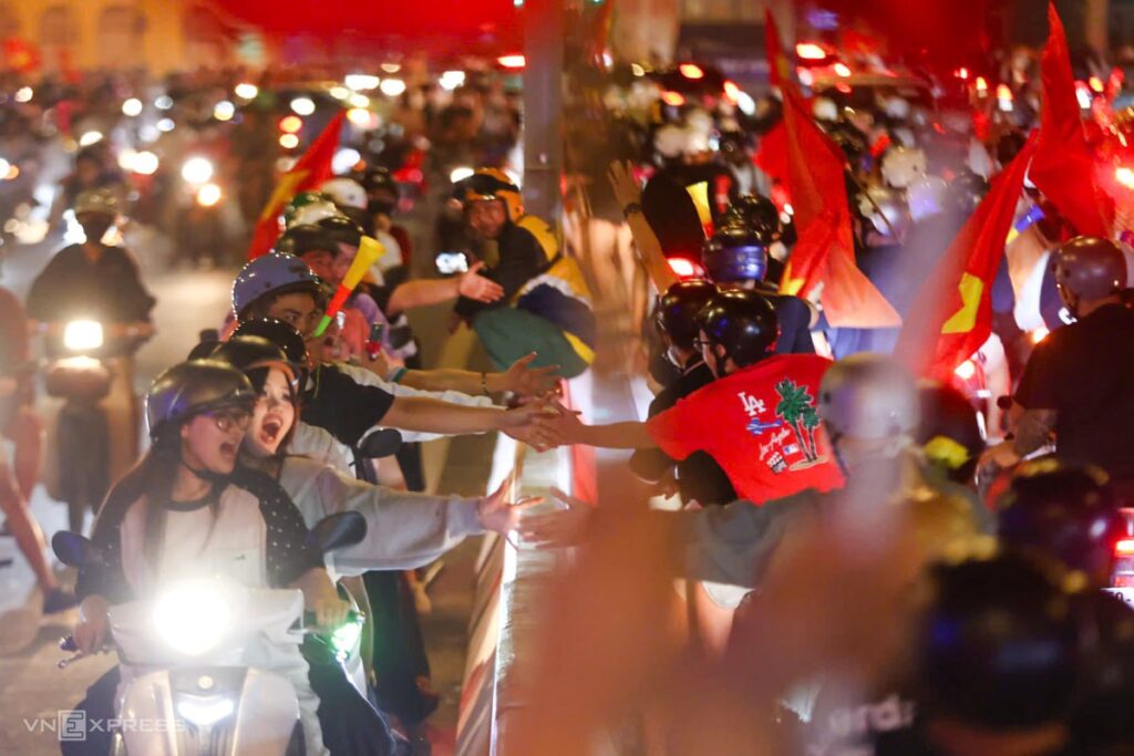 វៀតណាម៖ យោងតាមការចេញផ្សាយពីគេហទំព័រ VN Express បានប្រាប់ឲ្យដឹងថា ពីទីក្រុងហាណូយ ដល់ទីក្រុងហូជីមិញ និងទីក្រុងដាណាំង ផ្លូវនានាបានផ្ទុះឡើងនៅព្រឹកព្រលឹមថ្ងៃសៅរ៍ ខណៈរលកអ្នកគាំទ្របានអបអរសាទរជ័យជម្នះដ៏គួរឱ្យភ្ញាក់ផ្អើលរបស់វៀតណាមលើកូរ៉េខាងត្បូងដោយបាល់ប៉េណាល់ទី ៧-៦ បន្ទាប់ពីការប្រកួតស្មើ ២-២ យ៉ាងគួរឲ្យភ្ញាក់ផ្អើលក្នុងការប្រកួតដណ្តើមចំណាត់ថ្នាក់លេខ៣ នៃក្នុងព្រឹតិ្តការណ៍ការប្រកួតកីឡាបាល់ទាត់ពានរង្វាន់អាស៊ីអាយុក្រោម ២៣ ឆ្នាំ ឆ្នាំ២០២៦ “2026 U23 Asian Cup”។