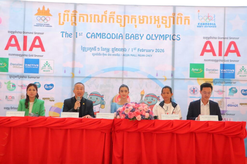 ភ្នំពេញ៖ ព្រះនាង នរោត្ដម ជេនណា និងលោក វ៉ាត់ ចំរើន រដ្ឋលេខាធិការក្រសួងអប់រំ យុវជន និងកីឡា និងអគ្គលេខាធិការគណៈកម្មាធិការជាតិអូឡាំពិកកម្ពុជា (NOCC) តំណាងលោកបណ្ឌិត ទេសរដ្ឋមន្រ្តី ថោង ខុន ទទួលបន្ទុកជំរុញការអភិវឌ្ឍចលនាកីឡា និងជាប្រធានគណៈកម្មាធិការជាតិអូឡាំពិកកម្ពុជានាថ្ងៃទី២៤ ខែមករា ឆ្នាំ២០២៦ នេះ អញ្ជើញជាអធិបតីក្នុងពិធីសន្និសិទសារព័ត៌មានស្ដីពីការប្រកួតកីឡាកុមារអូឡាំពិក នៅផ្សារទំទើប AEON 3 ជាន់ផ្ទាល់ដី។