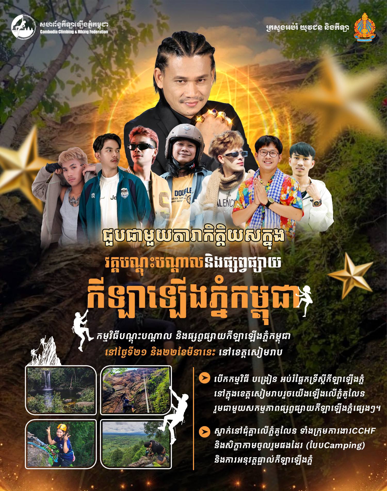 ភ្នំពេញ ៖ សហព័ន្ធកីឡាឡើងភ្នំកម្ពុជា ប្រកាសរៀបចំវគ្គបណ្ដុះបណ្តាល និងផ្សព្វផ្សាយកីឡាឡើងភ្នំ ដែលនឹងប្រព្រឹត្តិទៅ ចាប់ពីថ្ងៃទី២១ និង២២ ខែមិនា ឆ្នាំ២០២៦ នៅខេត្តសៀមរាប ក្រោមការប្រើប្រាស់ថវិកា គាំទ្ររបស់ក្រសួងអប់រំ យុវជន និងកីឡា ក្នុងឱកាសពិធីបើកវគ្គមាន ការអញ្ជើញ ចូលរួមពីថ្នាក់ដឹកនាំខេត្តសៀមរាប លោក ឡាំង អូណា ប្រធានសហព័ន្ធកីឡា ឡើងភ្នំកម្ពុជា និងមន្រ្តី សហព័ន្ធជាច្រើនរូបទៀត ពិសេសមានការចូលរួម ដោយតារាកិត្តិយសល្បីៗ ជាច្រើនរូបទៀត។