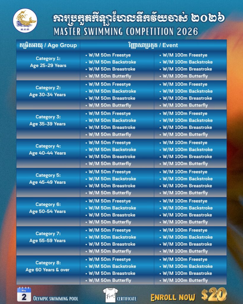 ការប្រកួតកីឡាហែលទឹកវ័យចាស់ ឆ្នាំ២០២៦ (Cambodia Master Swimming 2026) នឹងចាប់ផ្តើមថ្ងៃទី២ ខែឧសភា ឆ្នាំ២០២៦